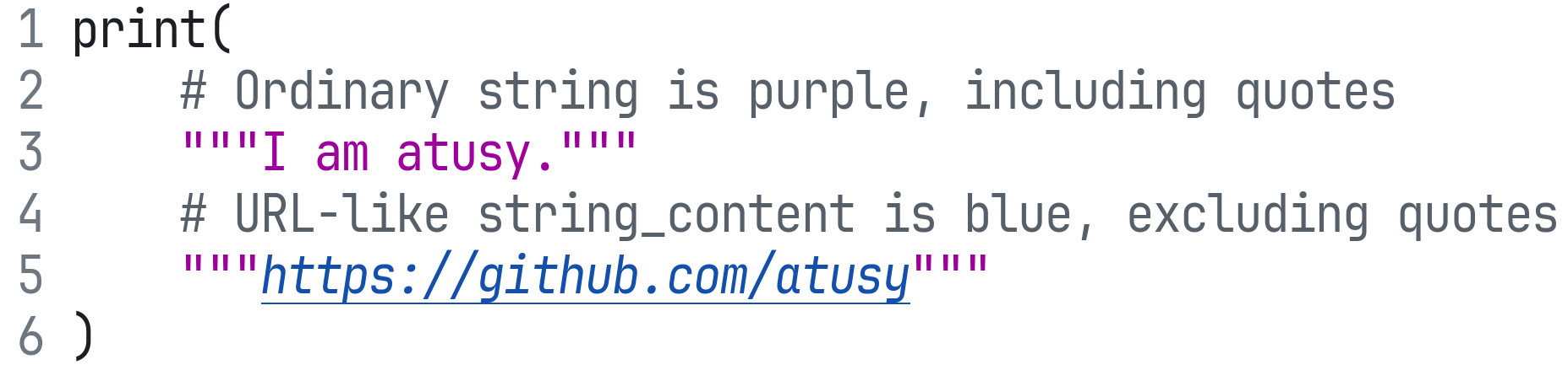 Demo scenario - Open examples/url.py - Start with blank query - Add `((string) @string)` - Add `((string) (string_content) @string.special.url)` - Update the above to `((string) (string_content) @string.special.url) (#match? @string.special.url "^https?://\\S+$")`